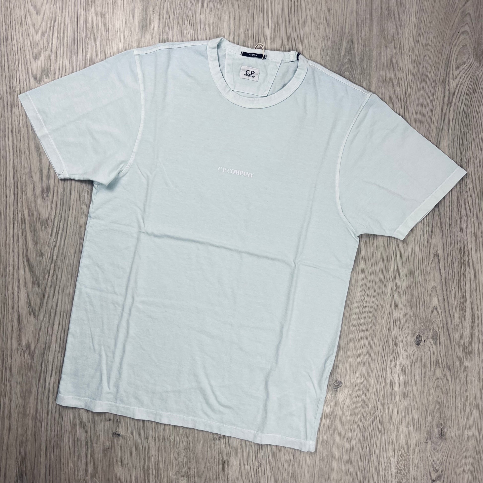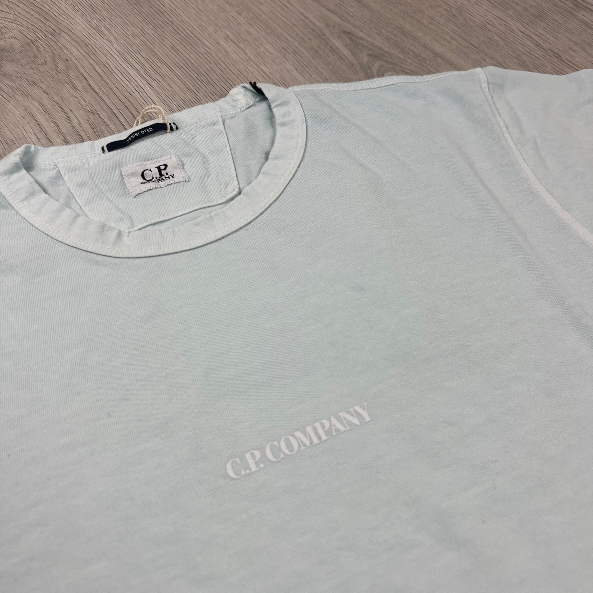 Blue CP Company 24/1 jersey resist dyed relaxed fit T-shirt with small logo print on the chest. Resist dye products are coloured individually, and therefore colours aren't always uniform - this is intentional and part of the unique design. Colour irregularities are not a fault.