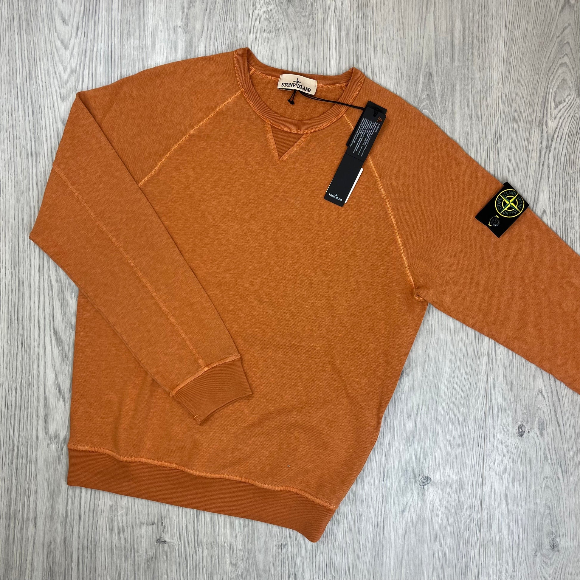 Sienna Rock orange Stone Island garment dyed 'OLD' treatment malfilé fleece sweatshirt with classic patch badge on the left sleeve